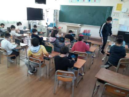 2年2組では、教室の格納棚に保管されているパソコンを出して、パスワードの入力、先日撮影した写真データの整理をしていました。1人1台配布されているパソコンなので、IDを改めて入力しなくてもよいので、今までより準備が早くできて手軽に使えるようです。これからも機会あるごとにパソコンを触るようにして、早く慣れて活用できるようになってほしいです。