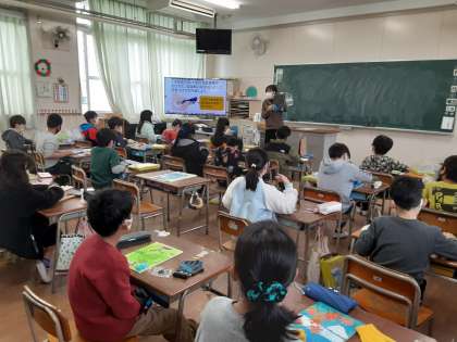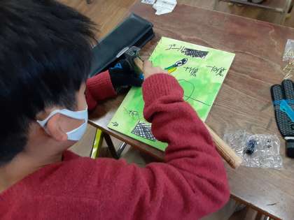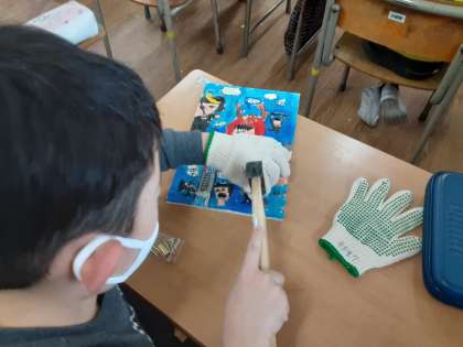 3年生は図画工作科で「コリントゲーム」を作っています。1組では台板にくぎを打っていました。怖がっている児童はほとんどいませんでした。児童によっては、慣れた手つきで次々にくぎを打っていました。