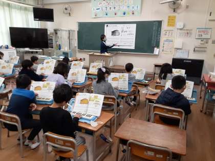 そのあと、けん盤ハーモニカで演奏の練習をしていました。まず先生が階名を読み、児童は指使いの練習を繰り返していました。指使いの練習の成果で、初めてのわりには演奏はできていたようです。