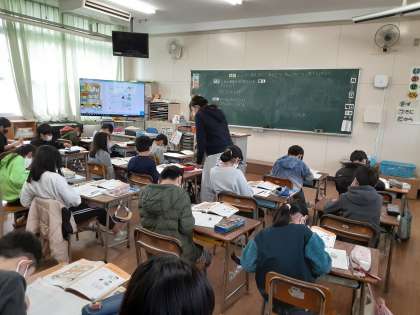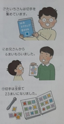 3年生では算数科で「□を使った式で表そう」の学習が始まりました。1組では、下記のお話の場面を式でどのように表すか考えました。はじめに持っていた切手を□枚としてたし算の式を立てていました。児童は、いろいろな考えで□に当てはまる数字を求めていました。これから多様な場面で□を求める方法を学んでいきます。かけ算の場面でも、□を求めることができるでしょうか。
