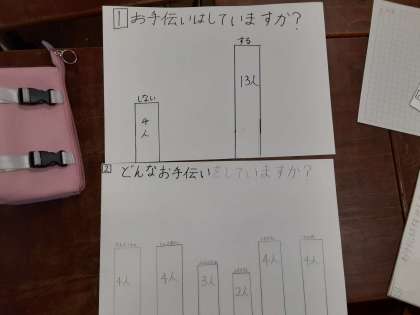 調べたことをほうこくしよう 公開日 2021/02/15 更新日 2021/02/15 お知らせ 4年生では国語科で「調べたことをほうこくしよう」を学習しています。各グループでは、アンケートの結果を集計して、わかったことをまとめていました。新型コロナウイルスについて調べているグループは、「もっと気をつけるように言わなければいけない。」お手伝いを調べたグループでは、「お手伝いしていない人もいてる。お手伝いした方がいい。」など、考えを話しながら活動をしていました。 いいね(0)