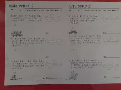 2年生では算数科で「図に あらわして 考えよう」を学習しています。1組では、まとめの練習問題をこなしていました。「花が86本咲いていたが何本か摘んだので残りは47本になった。」「リボンを何cmか買ってきて、26cm使ったので残りが74cmになった。」問題によって、図の中で□になる箇所が変わります。場面を思い浮かべて、図を基に式を考えられるようになってほしいです。