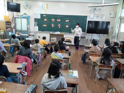 1年生は算数科で「かたちづくり」を学習しています。本時では、4枚の三角形色板を使って、いろいろな形を作っていきました。「おに」「手紙」「ヨット」「魚」児童は発想豊かに発見していきました。楽しく活動している間に「ずらす」「まわす」「うらがえす」動きをさせると形が変わっていくことに気づいていました。