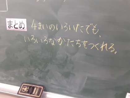 「まとめ」の文章を自分たちの言葉で考えていました。「4まいのいろいたでも、いろいろなかたちをつくられる」