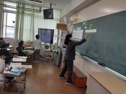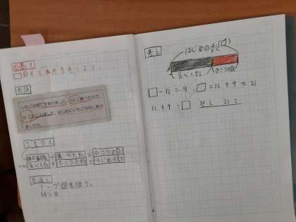 3年生は算数科で「□を使った式で表そう」を学習しています。2組では、文章問題のうち、わからない数字を□にし、表したテープ図を基にして式を考えていました。児童は隣と意見交換した後、全体で話し合い正しい考えにたどり着きました。