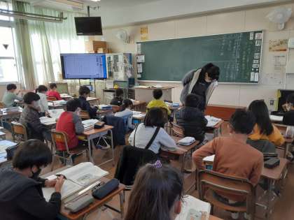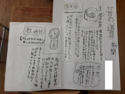 ゆうすげ村の小さな旅館 公開日 2021/02/22 更新日 2021/02/22 お知らせ 3年生では国語科で「ゆうすげ村の小さな旅館」を学習しています。2組では、時を表す言葉を基に場面分けして、出来事を整理していました。「若葉のきせつ」「ある日」「そのよく朝」などの言葉に着目して分けていきました。物語の大きな構成はつかめたようです。これから細かく読み進めて「(おもしろい)しかけ」を見つけてください。 教室の後ろには、「昔の道具について」など、総合的な学習の時間で調べた掲示物がありました。 いいね(0)