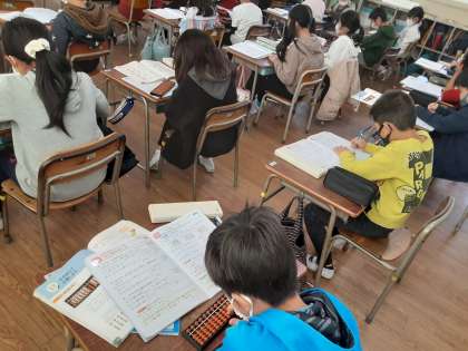 3年生は算数科で「そろばん」の学習をしています。1組では、そろばんを使って、たし算やひき算の練習をしていました。「22+15」「84−62」なら、まだ考えやすいのですが、「22+43」「84−42」となると、五玉と一玉を入れたりとったりして操作しなければいけません。くり上がりやくり下がりがあると、さらに大変です。児童にとっては手計算で筆算をする方が早いでしょうか。