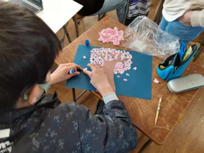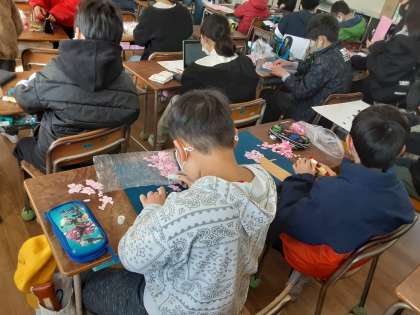 卒業を祝う会に向けて 公開日 2021/02/25 更新日 2021/02/25 お知らせ 5年生では学級活動に、卒業を祝う会で6年生への贈り物の準備をしていました。6年生へ向けてふさわしい漢字を書いて贈ります。本時では、漢字を書くための台紙を作っていました。卒業をイメージさせるきれいな桜模様です。 今年度、新型コロナウイルスの対応で、5・6年生の交流がほとんどできませんでした。しかし、異学年で仲よく協力し合うことの大切さは忘れないでほしいです。 いいね(0)
