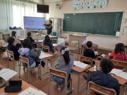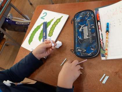 2年生では算数科で「はこの 形を しらべよう」を学習しています。2組では、ひごと粘土を使って箱の形を作っていました。前時は箱の面の形を紙に写し取って、箱に組み立てました。本時では、辺(ひご)や頂点(粘土玉)に目を向けるために取り組んでいます。