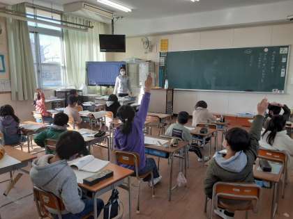 2年生では国語科で「あなの やくわり」について学習しています。1組では説明文の「はじめ」「なか」「おわり」の構成について考えていました。「はじめ」は、問いかけの文章に着目させていました。「なか」については、何の穴について書かれているかで4つに分けていました。「おわり」については、まとめの文章を見つけます。キーになる文や言葉を見つけられるようにがんばって読んでいました。