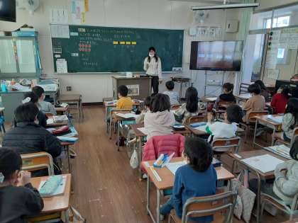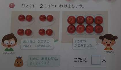 1年生では算数科で「おなじ 数ずつ わけよう」の学習をしていました。「8個あるりんごを同じ数ずつ分けると、何人に分けられますか。」という問題で、一人に「2個ずつ」分けます。図にかいて考える児童、ブロックで考える児童がいました。式で「2+2+2+2」と表せることにも気づいていました。