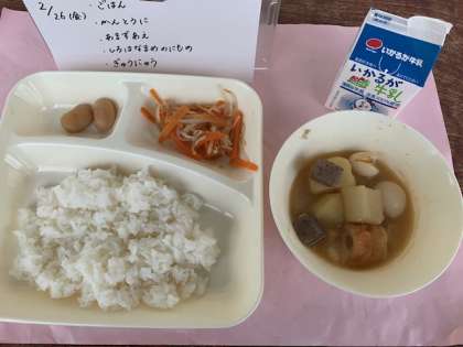 2月26日(金)の給食は、ごはん・牛乳・関東煮・甘酢あえ・白花豆の煮ものです。関東煮は「うずら卵」の個別対応食です。花豆はいんげん豆の仲間で、白花豆と紫花豆があります。白花豆は、花も実も白いものです。白花豆のほとんどは、北海道で作られています。硬めのしっかりした歯ごたえですが、その後ほのかな甘さが味わえます。