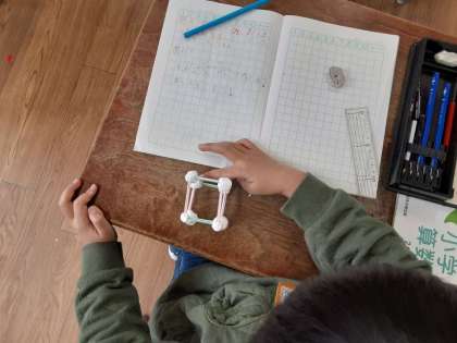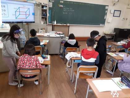 辺(ひご)や頂点(粘土玉)を数える 公開日 2021/02/26 更新日 2021/02/26 お知らせ 2年生では算数科で「はこの 形を しらべよう」を学習しています。1組で、ひごと粘土を使って箱の形を作っていました。できあがって、辺(ひご)の長さや数、頂点(粘土玉)の数を確かめていました。面がないので、見やすく、同じ頂点や辺を2度数えることがありません。辺の長さも確かめやすいようです。 教室の後ろには、カッターナイフタワーのすてきな作品が並んでいました。 いいね(0)