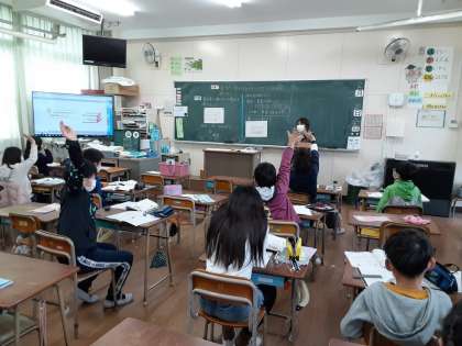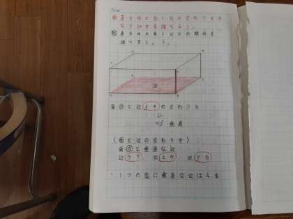 4年生では算数科で「直方体と立方体」の学習をしています。本時では、直方体の面と辺の交わり方や並び方について考えていました。面どうしや辺どうしなら平行や垂直な関係もわかりやすいのですが、面と辺については、しっかり空間を認識して考えなければいけないので、難しいかもしれません。「面も辺もずっと広がっているものとして考える」という先生からの助言から考えていました。