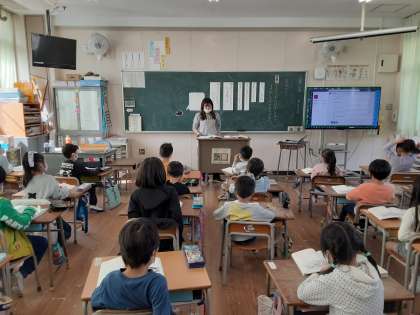 1年生では国語科で「スイミー」を学習しています。本時では第1場面から第6場面のうち、最も好きな場面を選びます。第4場面「すばらしいもの・おもしろいもの」を選ぶ児童が多いかと思ったのですが、第6場面「みんなで力を合わせて大きな魚を追いやる場面」でした。仲間を大切にする児童が多いからでしょうか。