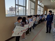 2組では、学級活動の時間、画用紙にメッセージを書き終えたようで、廊下に並んでいました。