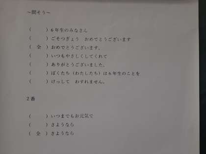 2年生では6年生を送る会に取り組んでいます。卒業生へ伝えたいメッセージを書き込んだ画用紙をもって、横1列に並びます。そして、「スマイル アゲイン」という音楽をBGMにして、贈る言葉を呼び掛けるようです。