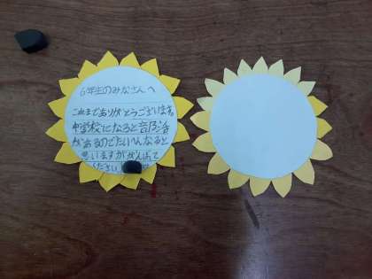 卒業を祝う会 公開日 2021/03/01 更新日 2021/03/01 お知らせ 4年生も学級活動で、卒業生へメッセージを贈る準備をしていました。花びらを1枚1枚丁寧に切り取って貼りつけていました。きれいにできた花のお手紙に、今までお世話になったことへの感謝の気持ちを込めて、メッセージを書き込んでいました。 早くできた児童は、新1年生へどんなメッセージを贈ろうかと考えていました。 いいね(0)