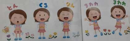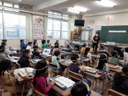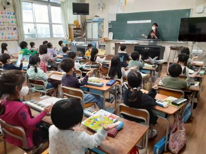 1年生は音楽科で「とんくるりん ぱんくるりん」を学習していました。音楽に合わせて、「とんくるりん……」や「まわれ まわれ……」のところで、手拍子をしたり振り付けをつけたりしていました。体を動かす中で、児童は「とんくるりん……」の小節と「まわれ まわれ……」の小節の曲想の違いに気づいたでしょうか。