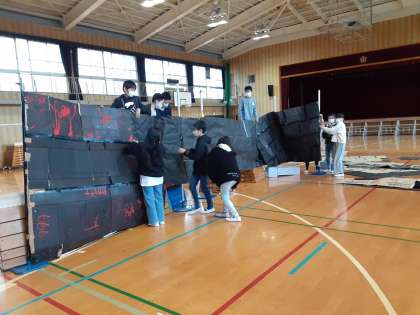 6年生が体育館で大掛かりなセットを作っていました。明日は、何やら楽しいことがありそうです。