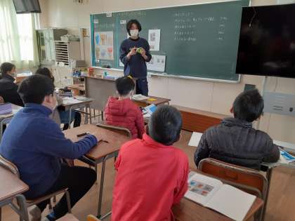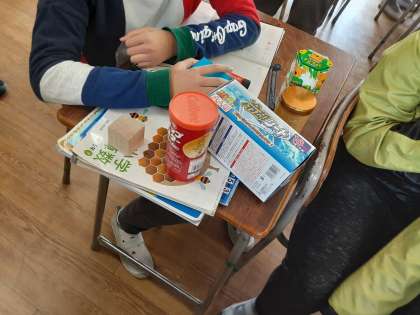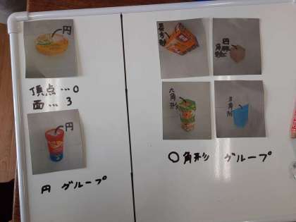 いろいろな形の箱が用意されています。これらの箱を2種類の仲間に分けます。4グループで話し合いをして、発表ボードにまとめていました。4グループとも「頂点がある・ない」「平らでない面がある・ない」など、どのような観点で分けるのか、自分の考えを交流し合っていました。そのあと、グループごとに発表していました。