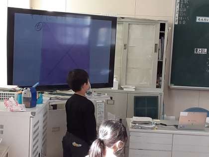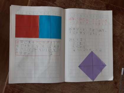 分けた 大きさの あらわし方を 考えよう 公開日 2021/03/03 更新日 2021/03/03 お知らせ 2年生では算数科で「分けた 大きさの あらわし方を 考えよう」を学習しています。2組では、前時に半分に折った折り紙を「1/2」ということを学びました。本時では、さらに半分に折ったときの大きさを考えます。 折り方には複数通りあるようで、どの場合でも4つの同じ大きさに分けられ、「1/4」ということ、そのような数を「分数」ということも新たに学びました。 いいね(0)