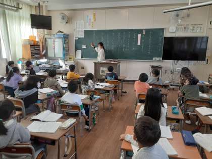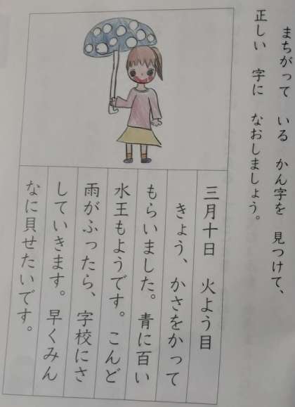 1年生では国語科で「かたちの にて いる かん字」を学習していました。前時では形が似ている漢字があるので、気をつけて書くことを学びました。本時では、教科書の例文を見て、間違っている字を正しく直していました。