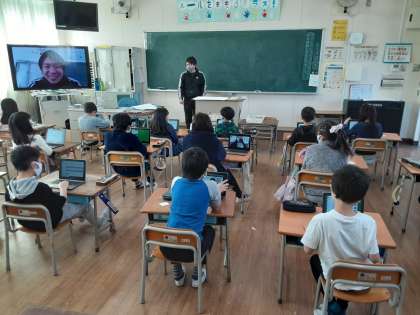 2組では、パソコンに自分の顔を何枚も写して、最もいいショットを選んでいました。口角を上げてにこっと笑った顔・微笑みながら歯を見せている顔・ベーっと舌を出している顔・すました顔、いろいろな顔の写真を撮っていました。そこから最も気に入った写真を選んで、次時から作業に入ります。