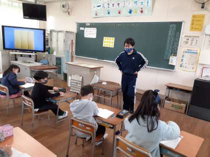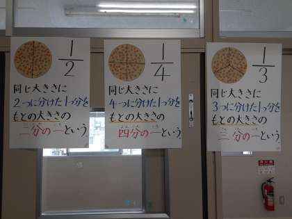 2年生では算数科で「「分けた 大きさの あらわし方を 考えよう」を学習しています。2組では、同じ数ずつ分けた1つ分の大きさを、分数を使って説明できるように考えていました。12個のブロックを2つのまとまりに分けると「1つ分は、12個の1/2で6個になります。」のように考えます。
