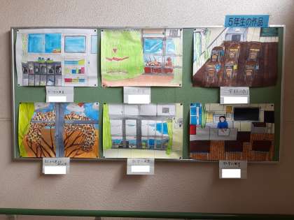 5年生の掲示板に学校の風景を写生した絵が掲示されていました。