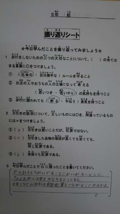 5年生「非行防止教室」の出前授業がありました。非行をしないための三つの大切なことについて学習しました。