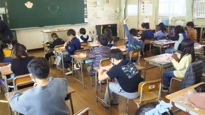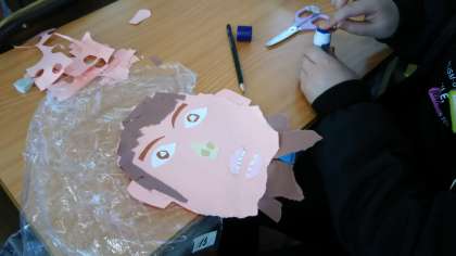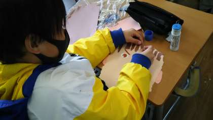 3年2組では図画工作科「紙版画」の学習をしました。今日は耳と髪の毛を切ったりちぎったりして作りました。次は体を作って昔あそびをしている様子を表現していきます。