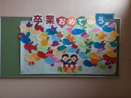 5年生の掲示板に、卒業をお祝いする掲示がされていました。