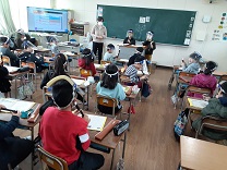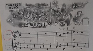 3年生では音楽科で「聖者が町にやってくる」を学習しています。1組では、リコーダーの2部合奏に挑戦していました。下のパートが「ソ・レ・ソ・レ・」と入ったら、上のパートが「ソシドレ・・・ソシドレ・・・〜」と入ってきます。先生の手拍子で上のパートがうまく入られるように何度か練習していました。うまく決まったときには、とてもきれいな響きが聴かれました。
