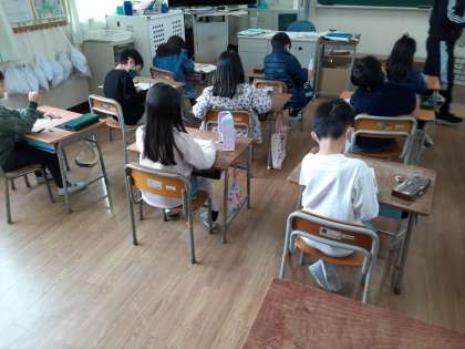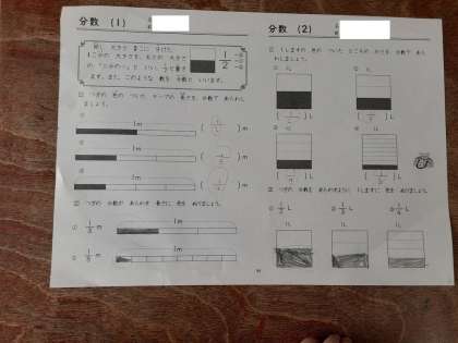 2年生では算数科で「分けた 大きさの あらわし方を 考えよう」を学習しています。2組では、練習のプリントをしていました。分数をはじめに見たときは整数や小数と比べて、数字とは思えなかったかもしれません。今では、違和感が薄くなってきたようです。