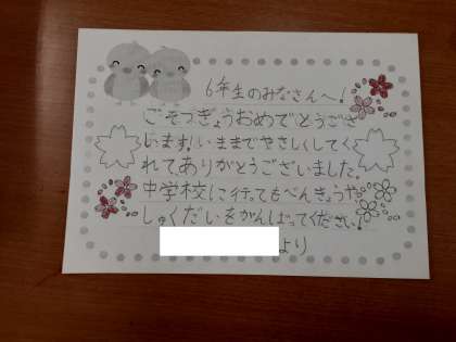 6年生のみなさんへ 公開日 2021/03/10 更新日 2021/03/10 お知らせ 2年生では学級活動で卒業を祝う会の準備を進めています。2組では、6年生へ贈るメッセージカードを作っていました。まず、どのようなメッセージを贈ったらいいのか、全体で話し合っていました。「いままで やさしくしてくれてありがとうございました」「また来てください」など、いろいろな言葉が発表されていました。 そして、一人ひとり心がこもった字でメッセージを書いていました。 いいね(0)