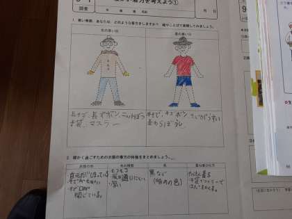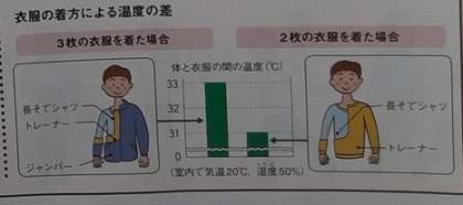 暖かく快適に過ごす着方 公開日 2021/03/10 更新日 2021/03/10 お知らせ 5年生では家庭科で「暖かく快適に過ごす着方」について学習していました。衣服の形や布の種類、さらに重ね着するなど着方を工夫して、温かく過ごす着方を考えていました。教科書には、なぜこの着方がいいのか科学的に説明されていました。 その後、生活場面や気候・天候によって衣服を選ぶことを学びました。給食・体育など、学校生活だけでも目的に合わせて服装を考えていることを振り返っていました。 いいね(0)