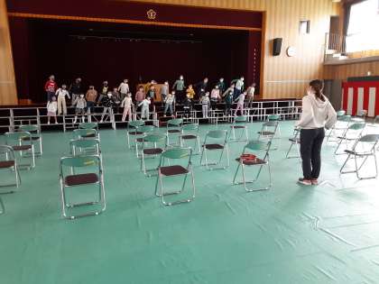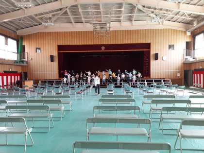 1年生が入学式で新入生に見せる演技を練習していました。「友だちに なろうよ」を歌いながら、振り付けをつけていました。来年度も入学式に新2年生は参列せず、録画で歓迎の気持ちを伝えます。1年生はひな壇の上で踊るように歌っていました。