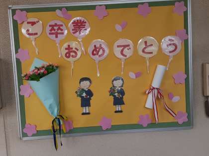 卒業式まであと4日 公開日 2021/03/16 更新日 2021/03/16 お知らせ 6年生が卒業式に向けて練習していました。本日は、細かい動きを確認していたようです。 校内のいろんな箇所の掲示板に、卒業をお祝いする掲示がされています。 いいね(0)