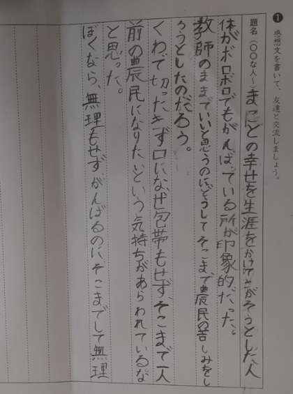 宮沢賢治 公開日 2021/03/17 更新日 2021/03/17 お知らせ 5年生では国語科で「宮沢賢治」について学習していました。本時では、「注文の多い料理店」「雨ニモマケズ」「グスコーブドリの伝記」のような名作を作った背景が書かれている伝記を読んで、感想を書いていました。自ら理想とする世界を作るために自ら苦労を選んで生きていく姿が、子どもたちには理解しにくいところがある一方で、共感しているところもあるようです。 いいね(0)