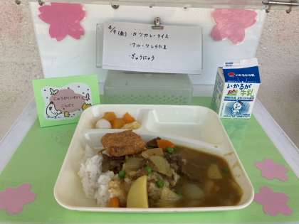 4月9日(金)の給食 公開日 2021/04/09 更新日 2021/04/09 お知らせ 4月9日(金)の給食は、カツカレーライス・牛乳・フルーツ白玉です。本日は新1年生の入学祝い献立になっております。カレーが好物の児童は多く、どの学年もお代わりの希望者が続出でした。辛いカレーの後、甘口のフルーツ白玉を食べて、大満足のようでした。 いいね(0)