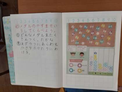 どんな メダルを たくさん つくったかな 公開日 2021/04/12 更新日 2021/04/12 お知らせ 2年生では算数科で「ひょうと グラフ」を学習しています。本時では、いろいろな種類のメダルを見て、どの種類のメダルがいくつあるかがわかるように整理していました。絵を見て、メダルの絵柄や色がわかるように描いていきます。 絵柄が結構複雑で、色も4色に分かれています。正確に整理するのが難しいようです。次回は、もう少し簡単に整理できないか考えていくようです。 いいね(0)