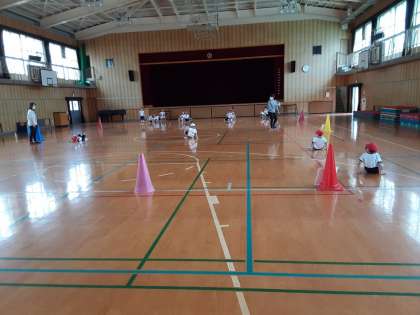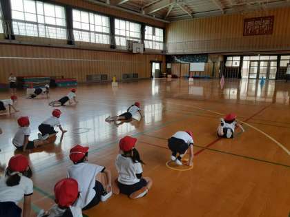 2年生では体育科で、体づくりの運動をしていました。一つ目のコーンまでは「アザラシ」の動きで、2つ目のコーンまでは「うさぎ」の動きで、3っつ目のコーンまでは「くも(蜘蛛)」の動きをして、最後のコーンをターンして戻ってきます。最初、「くも」の動きを後ろ向き四つん這いで動いていましたが、難しいので、前向き四つん這いの動きに変わりました。みんな笑顔で、楽しく遊びながら多様な動きをして活動をしていました。