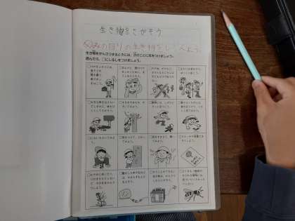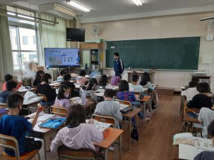 3年生では、理科で「どんな生き物がいるかな」を学習します。生活科が3年生になって理科になりました。2年生までの生き物探しとどこが違うのでしょうか?見るだけでなく、聴いたり匂いを嗅いだり、五感を使って探すようです。さらに、「むやみに捕まえない」「観察後は逃がす・元に戻す」など、生活科よりも気をつけることが多くなったようです。児童は、興味をもって話を聴いていました。