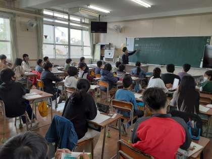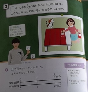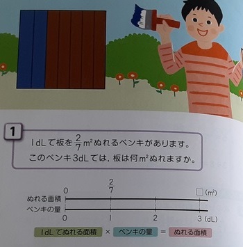 前の授業をどこが違うでしょうか 公開日 2021/04/13 更新日 2021/04/13 お知らせ 6年生は算数科で「分数のかけ算とわり算」を学習しています。前時では「1dlで2/7平方メートル塗れるペンキがあります。3dlでは何平方メートル塗れるでしょうか。」を考えました。本時では「2dlで4/5平方メートル塗れます。このペンキ1㎗では何平方メートル塗れるでしょうか。」という問題です。前時の問題との違いを考えて、式や解き方について話し合っていました。 いいね(0)