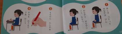 1年1組では国語科のはじめに、字を書く時の姿勢を確認していました。姿勢をよくするときの合言葉は「ピン・ピタ・グー」です。背筋を「ピン」・足の裏を床に「ピタ」・お腹と机の間は「グー」が入るくらいあけると自然とよい姿勢になります。
