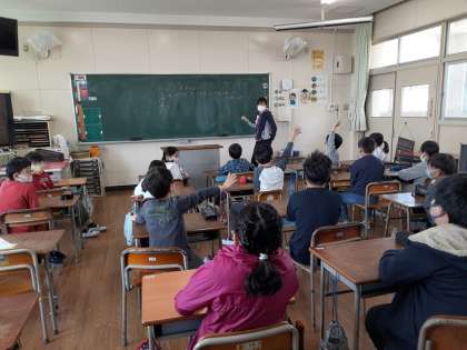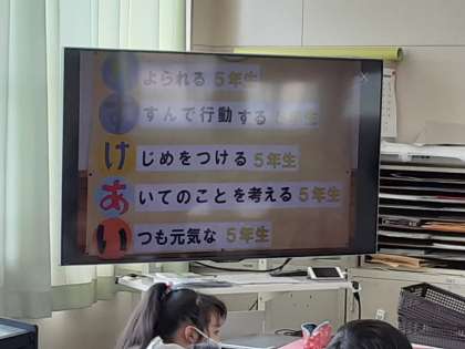 4年1組では学級活動の時間に、学級の目標を話し合っていました。「た」「す」「け」「あ」「い」のそれぞれの文字から始まる学級目標を話し合っていました。例が大型テレビに写し出され、それをヒントに考えていました。「た」は「たのしく」「たすけあう」の意見が出てきました。「す」は「すいえいができる」「すごく元気な」「すすんであいさつ」「すすんでやる気になる」……。どんな目標になるのか楽しみです。