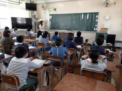 5年生では学級活動で学級目標について話し合っていました。黒板には目標の候補が英語で書かれており、続いてその単語を選んだ理由が書かれていました。
