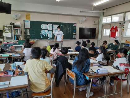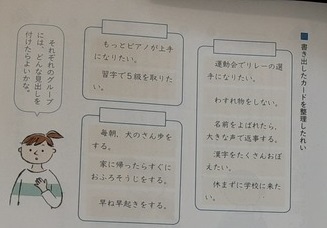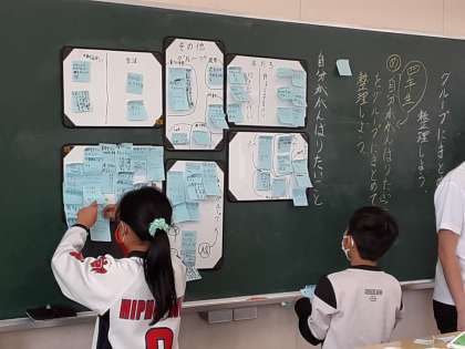 4年2組では「4年生になって自分ががんばりたいこと」について考えていました。がんばりたいことを付箋にいくつか書き出していくと、24人の学級なので付箋がいくつもできていました。見出しをつけて整理してホワイトボードに貼っていきます。