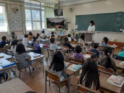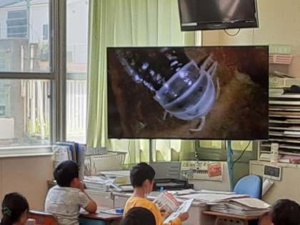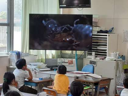 2年生では生活科の時間に、みんな食い入るように大型テレビの画面を見ていました。ダンゴムシが落ち葉や虫の死骸を食べる様子、糞をしたり水分を取ったりする様子、子どもを産む様子(ダンゴムシは体内に産卵します)や脱皮の様子、なかなか観られない貴重な場面でした。
